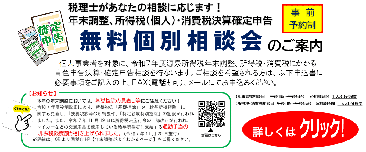 個人事業主の皆様 令和7年分年末調整、所得税・消費税決算確定申告無料個別相談会のご案内